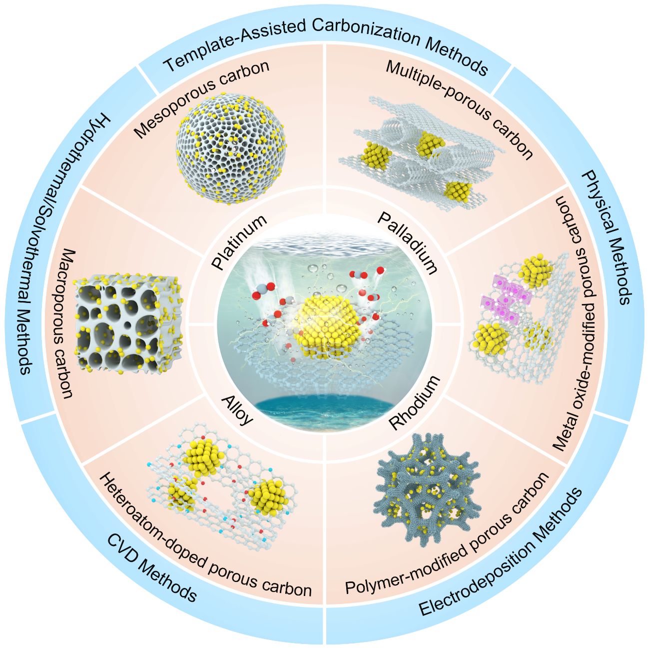 各种贵金属修饰纳米多孔碳电催化剂的微观结构示意图
