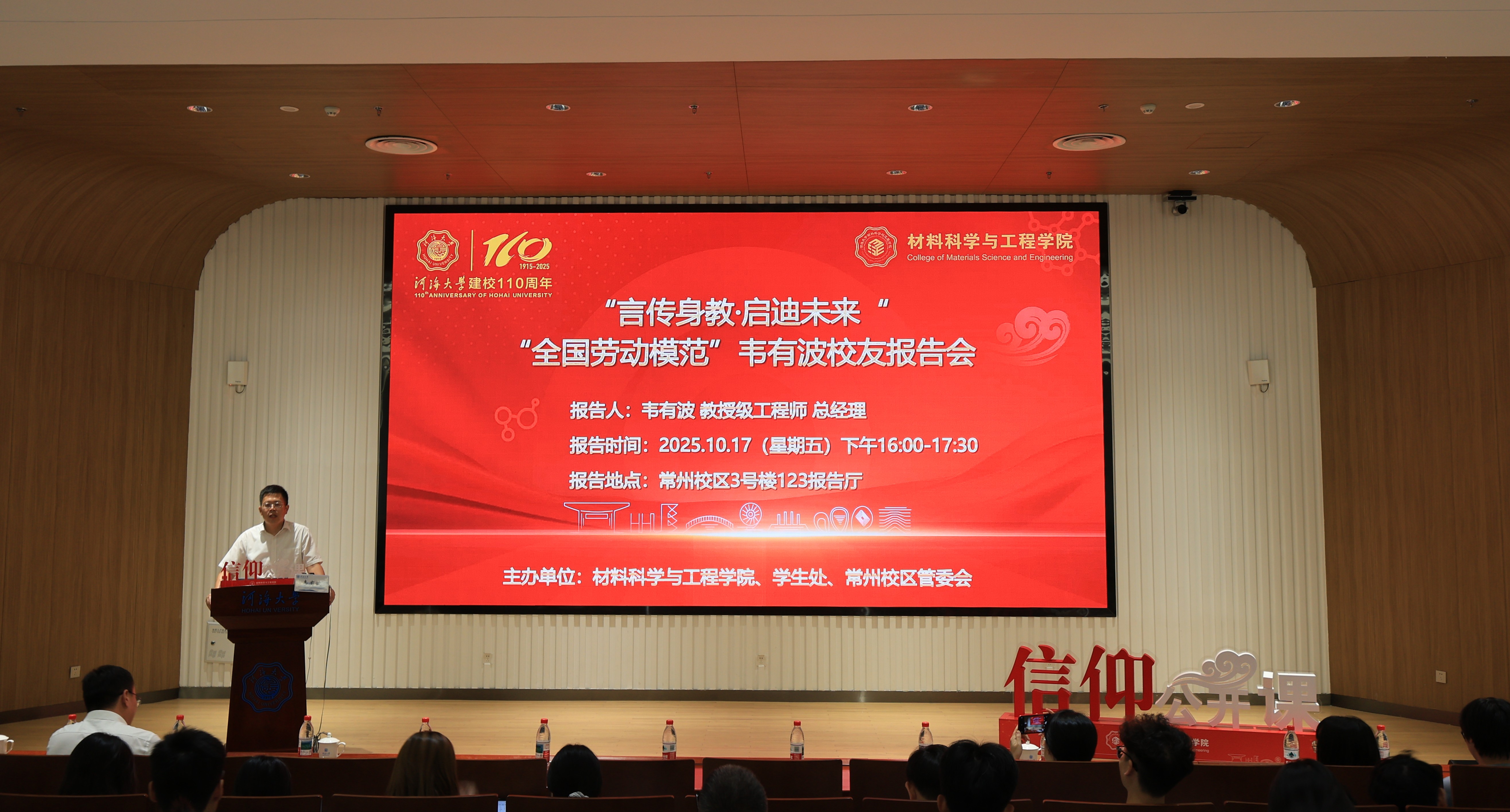 为使青年学子坚定将青春华章写在祖国大地上的选择,汲取校友榜样的奋斗力量,10月17日下午,91毛巾哥 与常州校区管委会联合举办“言传身教·启迪未来”——“全国劳动模范”韦有波校友报告会暨信仰公开课,2025年“全国劳动模范”称号获得者、我校2005届无机非金属材料工程专业校友韦有波应邀作题为《生成未来,做最好的自己》的分享报告。