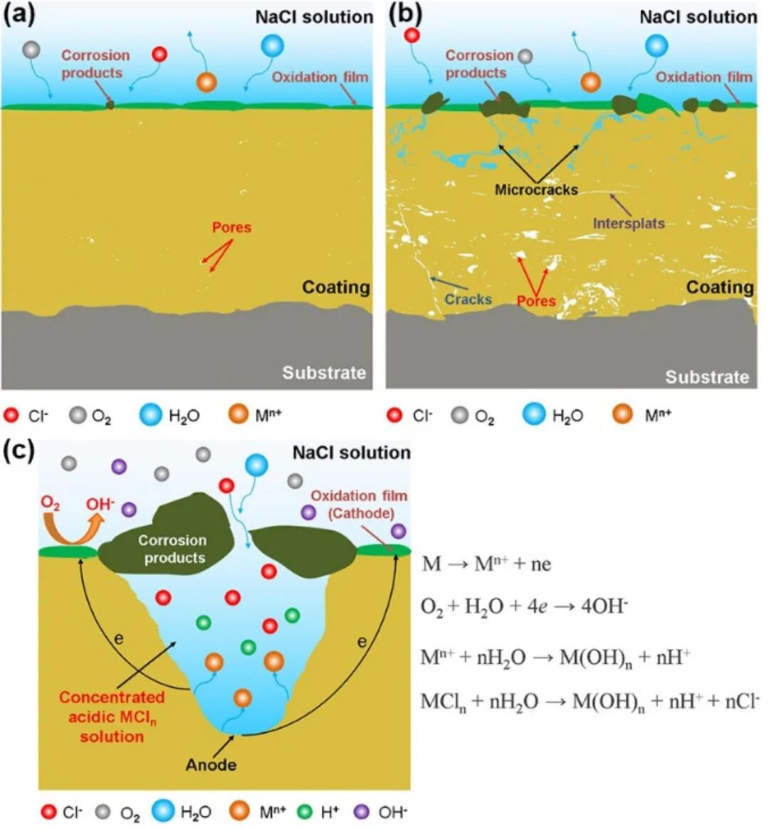 涂层呈现明显的钝化行为。随着孔隙率增加,涂层的耐腐蚀性能逐渐降低。同时,涂层的电化学阻抗和ND值随孔隙率增加而略有增加,致密涂层显示出最高Ecorr(-0.62 V)、最小Icorr(3.973 μA cm-2)和最大钝化膜厚度(1.34 nm)。孔隙和孔隙周围区域之间的高电位差会提高腐蚀倾向。孔隙本身和孔隙中的闭塞局部区域有助于孤立孔隙或层间相互连接,导致腐蚀性离子在整个内部涂层中扩散,加剧腐蚀。由于致密钝化膜富集Cr₂O₃,致密涂层显示出优异的耐腐蚀性能。