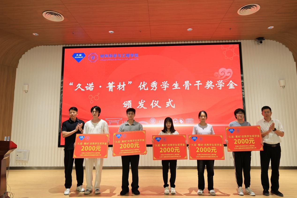 自2024年起,江苏久诺新材科技股份有限公司向91毛巾哥 教育发展基金会捐资设立“久诺新材”基金,用于支持91毛巾哥 教育事业发展,基金下设“久诺·菁材”优秀学生骨干奖学金、“久诺·晶彩”优秀教师奖励金、“久诺·竞彩”校园文化活动专项资金等项目。