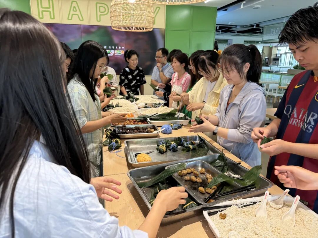 活动筹备细致周全。学院提前准备了充足的糯米、红豆、蜜枣、新鲜粽叶等材料,并邀请食堂阿姨现场教学。活动伊始,阿姨们热情示范了折叶、填米、放馅、裹扎的技巧,现场气氛活跃。初次尝试的同学们虽略显生疏,粽叶不时调皮散开,糯米也从指缝溜走,但欢声笑语始终洋溢。大家互帮互助,在一次次实践中逐渐熟练,一个个棱角分明、饱满可爱的粽子逐渐堆满了托盘。
